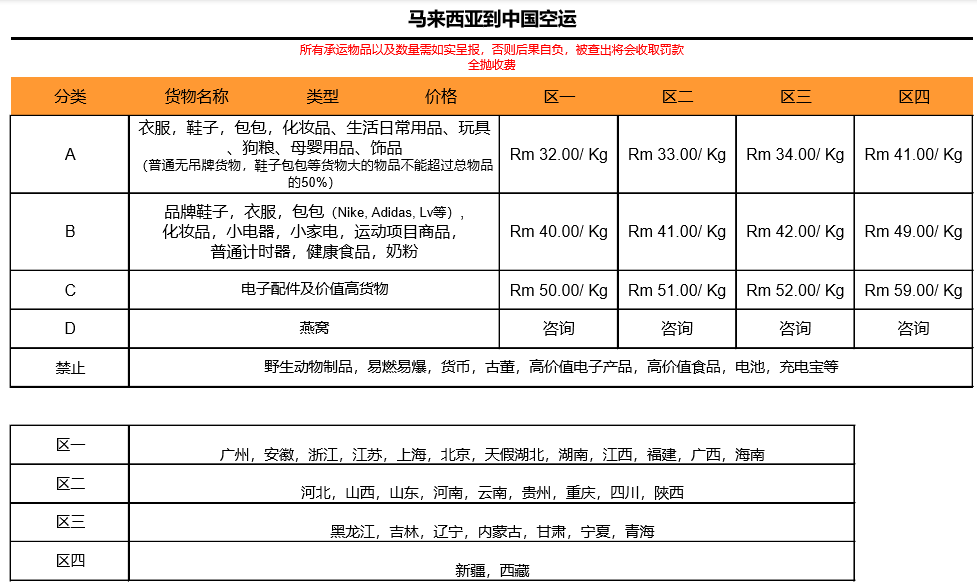 *在航空运输过程如货物丢失,严重损失赔偿按发票货值赔偿,最高不超过标准RM100/票, 易碎品除外,请自行包装完善;