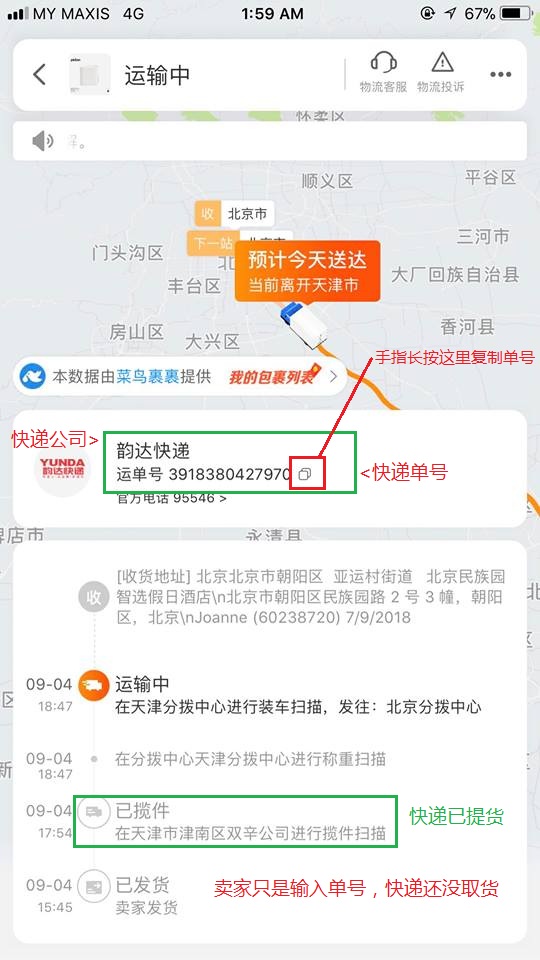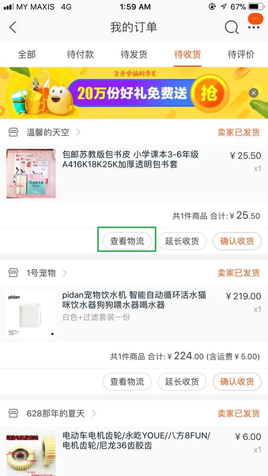 卖家发货后,查询卖家提的供快递单号 (以下为淘宝手机版)