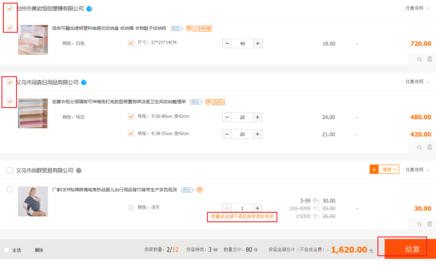 注意:如果不能打钩,表示数量不满卖家批发数量